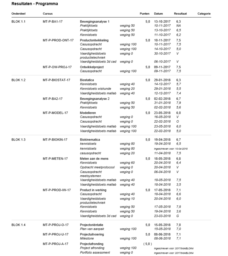 In de afbeelding is mijn cijferlijst te zien van afgelopen jaar. Ik heb in totaal twee 5en en twee 3en gehaald. Deze toetsen heb ik in de herkansing op weten te krikken naar een 6.0, 7.5 en een 7.8. Ik heb in totaal nu negen harde 7ens gehaald. Met deze cijferlijst heb ik laten zien dat ik dit niveau en deze studie aankan!